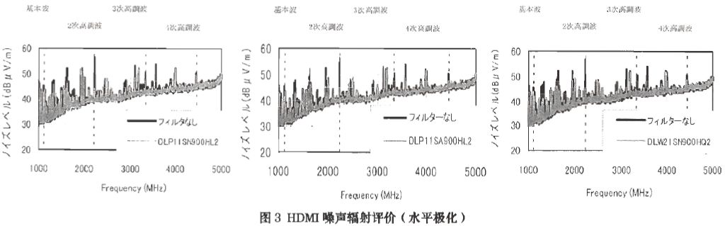 圖3所示為使用共模扼流圈后,HDMI輻射噪音的測量結(jié)果。從圖中可見,這種共模扼流圈圖可以抑制1GHz甚至更高頻率的噪音。實(shí)際上,它對高次諧波有很強(qiáng)的抑制效果。所有這些共模扼流圈應(yīng)用的效果來講,噪音在2.22GHz處衰減約為10db。圖中還顯示出由于使用了共模扼流圈,噪音在3.33GHz和4.44GHz時的衰減呈現(xiàn)多樣性。另外,從圖中可見,DLP11SN900HL2的噪音抑制效果比其它型號共模扼流圈差,這是因?yàn)镈LP11SN900HL2的Scc21值在3GHz及更高頻率處相對較低,如圖2所示。由圖2和圖3顯示結(jié)果可見,增加一個在30GHz及以上頻率處有10db以上衰減能力的共模扼流圈是必須的。