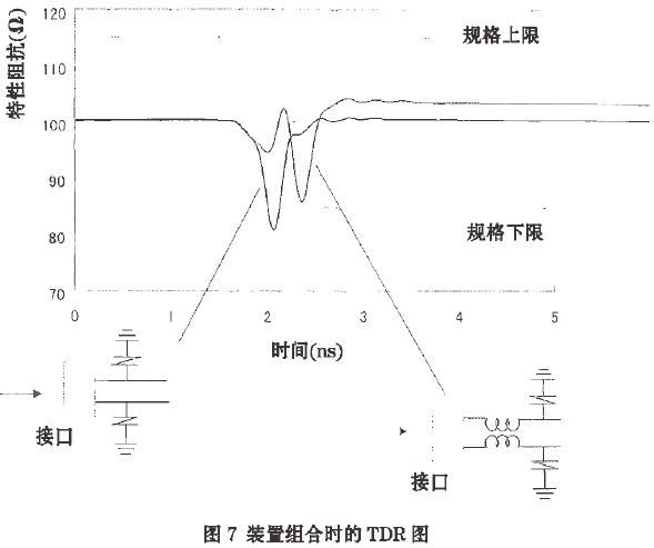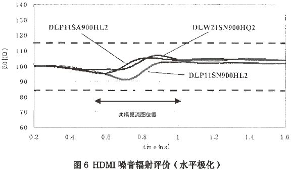 圖6所示的是用一個TDR測量儀器測試共模扼流圈的阻抗。零件的阻抗等于傳輸線的特性阻抗。為了使傳輸信號沒有輻射,阻抗匹配是必須的。圖6同時也顯示了共模扼流圈用于阻抗匹配的評價,符合HDMI標(biāo)準(zhǔn)要求的100+/-15Ω。由于使用了一個ESD器件的電容器,有時會造成阻抗不能滿足標(biāo)準(zhǔn)的需要。在這種情況下,用共模扼流圈加ESD壓敏電阻就可以滿足阻抗匹配標(biāo)準(zhǔn)了。圖7所示為在HDMI接口和1.0PF電容的ESD壓敏電阻之間加一個DLP11SN900HL2的阻抗情況。此時的阻抗已經(jīng)滿足阻抗匹配標(biāo)準(zhǔn)了。