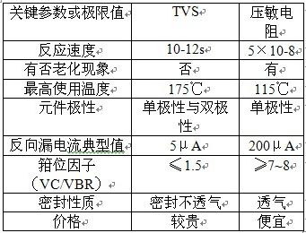 目前,國內不少需進行浪涌保護的設備上使用的是壓敏電阻。壓敏電阻是一種金屬化物變阻器。TVS比壓敏電阻的特性優(yōu)越得多,具體特性參數(shù)的比較如下表所示。