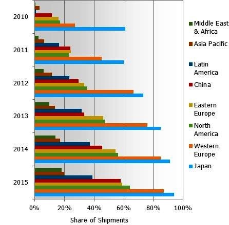 2010~2015年全球連網(wǎng)電視出貨比例,按區(qū)域市場(chǎng)