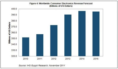 但不都是負(fù)面消息。雖然第二和第三季度的消費(fèi)電子營(yíng)業(yè)收入低于去年同期水平,但隨著電視與藍(lán)光播放器假日銷(xiāo)售高于2010年水平,上述趨勢(shì)將從第四季度開(kāi)始逆轉(zhuǎn)。IHS公司認(rèn)為,預(yù)計(jì)2012和2013年增長(zhǎng)率將超過(guò)4%,相比于當(dāng)前的低迷狀態(tài),屆時(shí)多數(shù)消費(fèi)電子領(lǐng)域?qū)?huì)恢復(fù)活力。