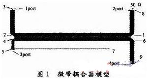 微帶定向耦合器在ADS中的模型如圖1所示。是一個四端口器件,中間是一段耦合線。四個端口分別連接于外部的50Ω端口。從5點到7點是高阻抗線,7端點接地,這個長度是一個變量。連接每個端口(3端口除外)的微帶線寬度是2.25mm,長度是14.4mm,3端口連接的微帶線寬度是1.4mm,長度是5mm。耦合線的長度是57.7mm,導帶寬度是2.1mm,導帶間距是O.45mm。本文主要討論高阻抗線的作用,所以先將高阻抗線長度置于零。PCB板采用PTFE材料,介電常數(shù)是2.5,厚度是0.5cm。