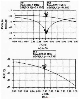 圖2(a)是S31和S41的圖,在900MHz時S31為-19.116dB,S41為-25.589dB。圖 2(b)是S11的圖,在800MHz~1GHz之間,S11均在-12dB和-20dB之間。從圖2上可以看出,這個耦合器的性能并不好。首先是S11 在900MHz時僅為-15.39dB,定向耦合器是一個直通的設備,一般來說S11必須要在-30dB以下才合適,否則插入損耗有些過大,對系統(tǒng)有一些損害。另外定向性過低,在900MHz時,隔離度為-25.589dB,耦合度為-19.116dB,定向性只有6dB左右,而且在整個頻段,定向性都不超過8dB。這個結(jié)果顯然比較符合上文計算的結(jié)果,S11=-15.39dB接近上文中的-14.42dB,而S31=-19.116dB和最大耦合功率的理論值-19.48dB也比較接近。