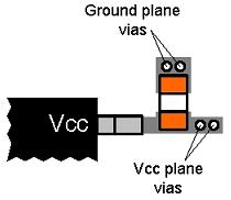 通過將電容的電源端直接連接至器件的電源端,然后經(jīng)過孔連至Vcc層,在器件上安裝小容量的0.1μF或0.01μF旁路電容。經(jīng)數(shù)個過孔將電容接地端連接至接地層(請參見圖6)。