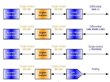 所有接口都有一個相同點,那就是數(shù)字隔離器必須安裝在隔離接口的單端3V/5V部分。