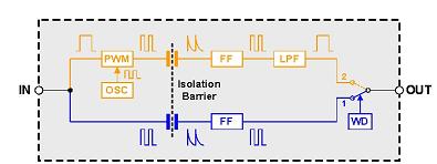 藍色部分所示路徑中處理的高速信號被電容式隔離勢壘分為多個快速瞬變脈沖群。隨后的觸發(fā)器(FF)將這些瞬態(tài)脈沖群轉(zhuǎn)換成波形和相位均與輸入信號一致的脈沖。內(nèi)部看門狗(WD)檢查高速信號邊緣的周期性。在低頻輸入信號情況下,連續(xù)信號邊緣間的持續(xù)時間超出了看門狗窗口。這樣便迫使看門狗將輸出開關(guān)位置從高速路徑(位置1)改變?yōu)榈退俾窂?位置2)。
