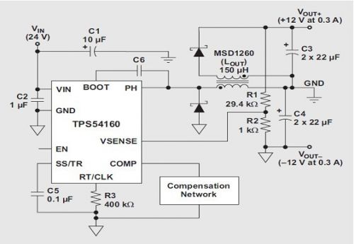 匹配正負(fù)電源軌是許多工業(yè)應(yīng)用的常見要求,對(duì)放大器而言更是如此。我們可以對(duì)寬輸入范圍降壓轉(zhuǎn)換器進(jìn)行配置,以提供負(fù)輸出電壓。使用一個(gè)耦合電感代替這種反相降壓轉(zhuǎn)換器的電感,并增加一個(gè)二極管和電容器,便可將這種反相降壓轉(zhuǎn)換器變?yōu)橐粋€(gè)雙輸出的轉(zhuǎn)換器。圖 3 顯示了以這種方法使用的 TI TPS54160 和 Coilcraft 150-μH MSD1260。只要每個(gè)軌的負(fù)載稍有接近,我們就對(duì)每個(gè)軌之間的差異進(jìn)行調(diào)節(jié)而非單獨(dú)調(diào)節(jié)每個(gè)軌,但耦合電感卻可以幫助提供對(duì)每個(gè)軌進(jìn)行調(diào)節(jié)。