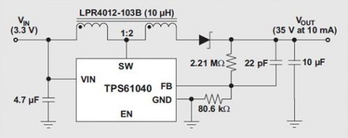 集成 FET 的 DC/DC 轉(zhuǎn)換器的輸出電壓受限于轉(zhuǎn)換器的開關(guān)電流額定值。將一個(gè) 1:1 以上匝比的耦合電感連接至轉(zhuǎn)換器的開關(guān) (SW) 引腳,可以擴(kuò)展所有升壓轉(zhuǎn)換器的有效輸出電壓范圍。例如,圖 4 顯示了 30-V 絕對(duì)最大電流額定值的 TI TPS61040 升壓轉(zhuǎn)換器,其作用是提供 35V 或更高的電壓,同時(shí)還顯示了一個(gè) 1:2 耦合電感 Coilcraft LPR4012-103B。耦合電感結(jié)構(gòu)多繞組端與二極管串聯(lián)時(shí),單繞線電感——以及由此產(chǎn)生的轉(zhuǎn)換器開關(guān) FET—電壓只有輸出電壓的三分之一,即負(fù)輸入電壓。