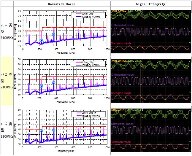 圖5顯示的MHL信號(hào)線使用各種共模扼流線圈時(shí)的輻射噪聲/信號(hào)波形評(píng)測(cè)結(jié)果。共模扼流線圈在產(chǎn)生噪聲的30MHz~1GHz頻率段內(nèi),按照阻抗由高到低的順序,分別使用以下3種類型(90Ω、45Ω、15Ω@100MHz) (靜態(tài)特性請(qǐng)參考圖6) 來進(jìn)行測(cè)量。