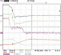 圖2中CH1是高端 (HS) MOSFET M1的柵極-接地處電壓。Ch2是同圖中HS MOSFET M1的源極-接地處電壓。圖2中M1跡線Ch1-Ch2的計(jì)算值,表示HS MOSFET的柵-源電壓。Ch3和Ch4分別是M2和M1的漏電流。