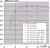源極電感對效率有著更明顯的影響。某些情況下,在達(dá)到最大電流之前我們不得不中止試驗(yàn),因?yàn)镸OSFET的溫度大于130℃。圖5所示為控制MOSFET的研究結(jié)果,仔細(xì)檢查這些結(jié)果可知: