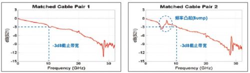 圖1,匹配電纜對的頻率響應(yīng),額定帶寬為18GHz。-3dB截止帶寬實際上大約為10GHz,低于額定帶寬。除此之外,兩條電纜的特性不相似,可能在部分信號內(nèi)容過度衰減或放大時導(dǎo)致波形失真。特別是在第二條匹配電纜對上,可以在5GHz~8GHz之間看到頻率響應(yīng)凸起