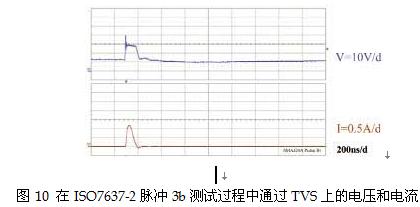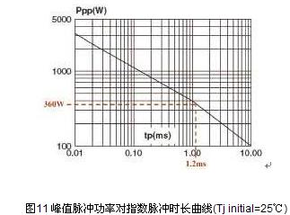 我們要解決的問題是根據(jù)所要消除的電涌來確定保護(hù)元器件的參數(shù)。以圖8中的ISO7637-2 脈沖2為例,不難看出,抑制器上的鉗制電壓大約是30V,峰值脈沖電流 (Ip)大約是12A,在Ip/2點(diǎn)測(cè)得電流脈沖時(shí)長(tp)是4μs。因此,可判定TVS必須消耗360W的最大脈沖功率(Pp) 。所有這些Pp、Ip和tp值是有用的,因?yàn)樗鼈兛梢詭椭容^TVS數(shù)據(jù)表中的峰值脈沖功率對(duì)指數(shù)脈沖時(shí)長的曲線,以確保TVS在應(yīng)用的限制范圍內(nèi)。