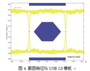 還有一種方法可以檢查這個(gè)軌對(duì)軌保護(hù)元器件對(duì)USB協(xié)議正常工作模式的影響,就是通過圖4的眼圖響應(yīng)來分析信號(hào)數(shù)據(jù)位的完整性。