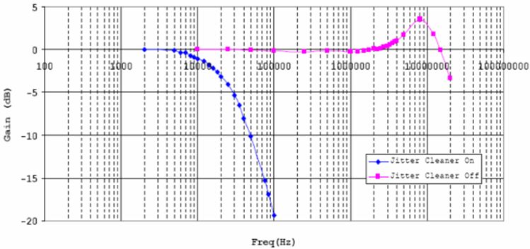 2)由于串并模塊里的高頻倍頻器環(huán)路帶寬很大,最大可達30MHz左右。故TLK3132內部集成了一顆基于LC振蕩器的抖動濾除鎖相環(huán),環(huán)路帶寬通常設置在幾百KHz以內,可以對輸入參考時鐘進行濾除,降低參考時鐘對幾百KHz 以上抖動性能的要求,圖6是TLK3132發(fā)送鏈路在抖動濾除器打開和關閉下的環(huán)路傳遞函數。此外,抖動濾除器也可對鏈路恢復的時鐘(只可接收CH0通道的恢復時鐘RXBCLK(0))進行抖動濾除,提高恢復時鐘的信號質量。