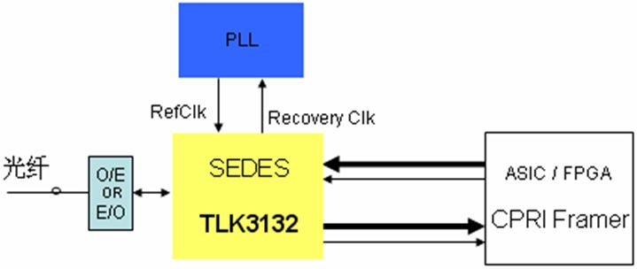 為了處理射頻模塊拉遠技術中基帶單元和射頻單元的光纖鏈接,國際上成立兩個標準化組織:一個是CPRI (Common Public Radio Interface),在2003年由華為、愛立信、NEC、西門子和北電發(fā)起成立的組織,致力于基帶、射頻接口的標準化;另一個是OBSAI (Open Base Station Architecture Initiative),由諾基亞、LG電子、三星電子等成立的聯(lián)盟。二者都定義了使基帶和射頻分離的標準化接口,也就是將宏基站分為基帶單元BBU和遠端射頻單元RRU兩部分,BBU和RRU之間傳送I/Q數據和控制管理數據,其信號格式就是CPRI或者OBSAI所定義的標準接口。本文以CPRI接口為例,詳解TLK3132在射頻模塊拉遠技術中的應用。