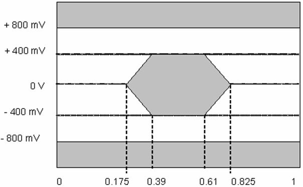 在高速數據鏈路通信中,抖動指標是非常關鍵的,CPRI接口相應推薦了高速串行信號的眼圖和抖動規(guī)格。在SERDES發(fā)送側,CPRI要求的眼圖模板如圖8所示。