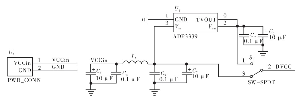 傳感器節(jié)點體積微小,通常攜帶能量有限的電池。能量供應模塊在無線傳感器節(jié)點中至關重要,為傳感器節(jié)點各部分提供能量。需要長時間數據采集的傳感器有的需要太陽能等方式來維持節(jié)點的正常運轉。節(jié)點的各部分也需要精心設計。節(jié)點微處理器的工作電壓為1.8~3.6 V,無線射頻芯片工作電壓為2.1~3.6 V,Flash供電電壓為2.7~3.6 V,USB轉換芯片由USB供電。因此電源可以選用3 V紐扣電池供電,有效減少了節(jié)點的大小。另外USB也可以作為供電源,同時作為編程電源,電源單元如圖2所示。LC濾波單元對交流電具有較好的濾波效果,同時又不會降低直流輸出電壓。低壓差的穩(wěn)壓器ADP3339保證了電源較好的穩(wěn)壓性。