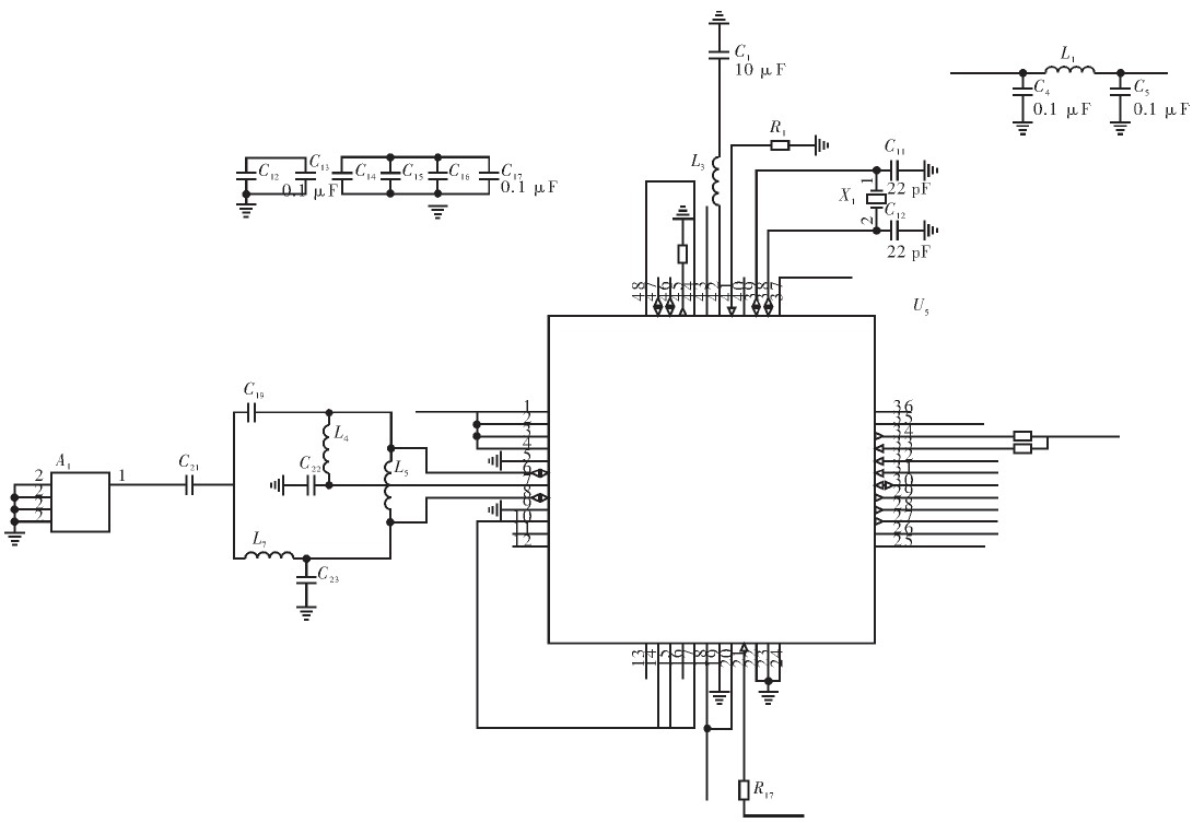 圖3中無線射頻模塊的外圍電路采用CC2420手冊提供的典型應用電路的器件數值,這樣保證了芯片能工作在正常狀態(tài)。另外為達到最優(yōu)性能,必須使用電源去耦,去耦電容和電源過濾的設置和大小對于在應用中獲得最優(yōu)性能起著關鍵作用,TI提供一個緊湊的參考設計,必須嚴格按照該設計進行。同時增加數字、模擬電源采用電容濾波。CC2420需要一個16 MHz的參考時鐘用于傳輸速率為250 kbit·s-1的數據收發(fā),參考時鐘可以來自外部時鐘源,也可以由內部晶體振蕩器產生,這里采用內部晶體振蕩器產生的方式。天線阻抗匹配至關重要,為獲得較好的發(fā)射功率,在原有基礎上對部分電容、電感進行了適當的調整。CC2420與微控制器的通信通過4線SPI總線實現(SI、SO、SCLK、CSn),通過控制FIFO和FIFOP管腳接口狀態(tài)可以使芯片工作在發(fā)射或接收模式,另外CCA用于空閑信道評估,SFD用于控制時鐘或定時信息的輸入。