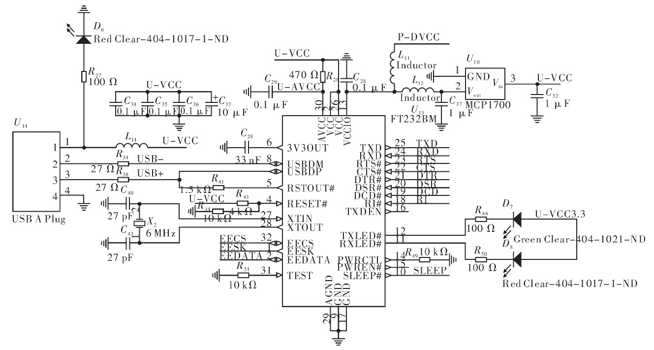 無線傳感器網絡由大量節(jié)點組成,這些節(jié)點按一定協議將采集的數據進行融合、傳輸,最終將數據傳送到個人電腦上進行處理和觀察,同時節(jié)點工作需要將特定的程序寫入Flash中。目前個人電腦最常用的接口為USB,而微處理器使用USART接口,為實現兩種接口之間轉換,節(jié)點使用FT232BM芯片作為轉換芯片。FT232BM是一種單片USB到異步串口轉換芯片,支持全握手和調制解調接口信號,在TTL級數據傳輸速度范圍為300 bit·s-1~3 Mbit·s-1.芯片通過USB總線供電,工作電壓為4.35~5.25 V,采用外部6 MHz時鐘。USB PID、序列號和產品信息可以保存在外部EEPROM中。USB通信模塊接口如圖5所示。