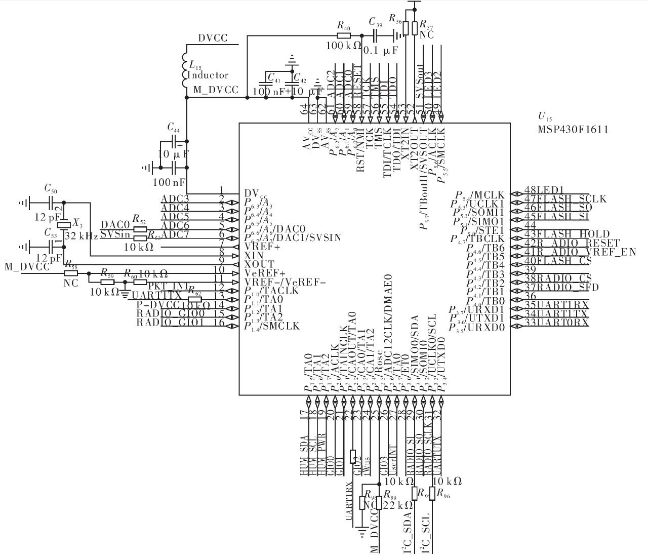 微處理器是無線傳感器節(jié)點的核心,傳感器數據的數據處理,串行口以及無線模塊的傳輸與控制均需要微處理器的參與。節(jié)點微處理器TI公司的16為超低功耗MSP430F1611.該微處理器工作電壓為1.8~3.6 V,在RAM數據保持方式下耗電僅為0.2μA,在激活工作1 MHz的情況下為330μA,可以工作在5中低功耗模式,喚醒時間<6μm.Flash大小為48 kB,RAM大小為10 kB.芯片內部有16位定時器Timer_A和Timer_B具有捕獲/比較功能;大量的捕獲/比較寄存器可用于事件計數、時序發(fā)生等;多功能串口(USART)可以實現異步、同步和I2C串行通信,可以方便地實現多級通信的應用;具有較多的I/O端口,最多達6×8條I/O口線,P1、P2口還可以接收外部上升或下降沿的中斷輸入;12位A/D轉換器有較高的轉換速率,最高可達200 kbit·s-1,能滿足大多數數據采集的應用。微處理器模塊如圖6所示。溫度濕度傳感器連接P1口5、6、7管腳,無線模塊SPI接在P3口1、2、3和P4.4管腳,USB通信模塊數據線連接到P3口6、7管腳。其他管腳分別用于控制和擴展接口。外部晶振大小為32MHz。