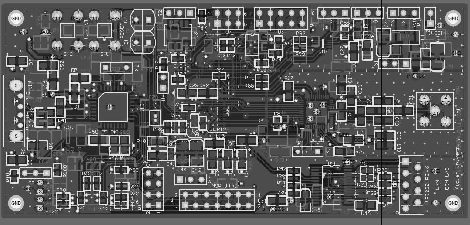 電路板根據不同的標準有不同的分類,在設計中大多數根據板的數目分類,在電氣連接關系復雜的電路板設計中,雙面板難以滿足電路布線的要求,這時就必須考慮使用多層板。本節(jié)點采用4層板,頂層主要是USB模塊和無線模塊,底層為微處理器模塊,內部層為電源層和地層。設計結果如圖7所示。