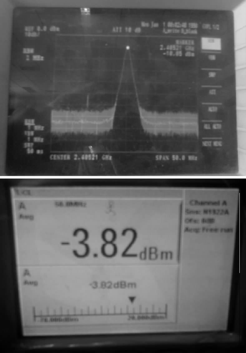 為對設計的節(jié)點功能進行驗證,首先使用IAR集成開發(fā)環(huán)境編寫CC2420的測試程序,通過JTAG將程序燒入Flash,經過檢測,射頻部分較好地滿足了預期。芯片工作頻帶范圍為2.4~2.48 GHz,發(fā)射功率為0 dBm.經過頻譜儀和頻率計驗證設計符合要求,驗證結果如圖9所示。