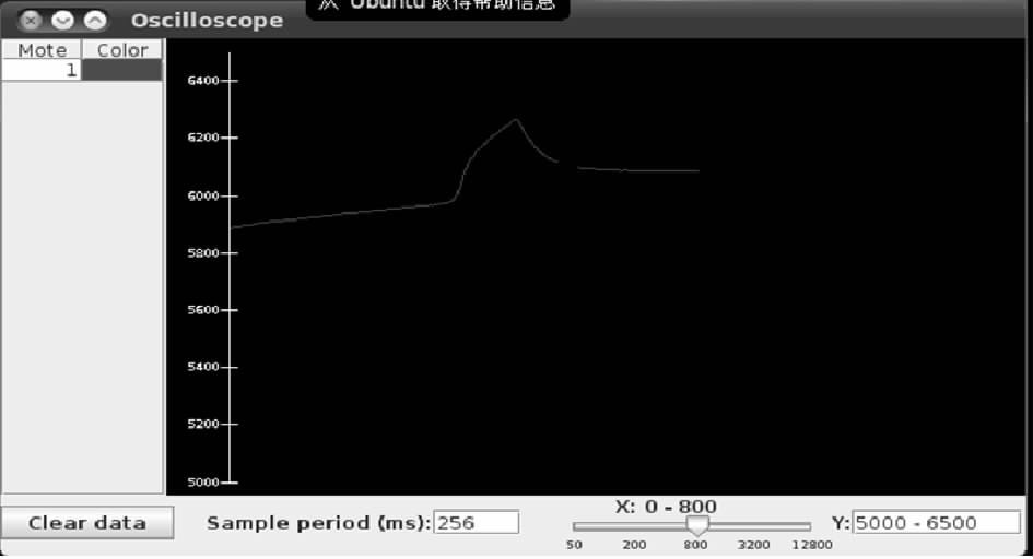 TinyOS是UC Berkeley開發(fā)的開放源代碼操作系統(tǒng),專為嵌入式無線傳感器設計,操作系統(tǒng)基于構件的架構使得快速更新成為可能,而這又減小了受傳感器網絡存儲器限制的代碼長度。TinyOS的構件包括網絡協議、分布式服務器、傳感器驅動及數據識別工具。其良好的電源管理源于事件驅動執(zhí)行模型,該模型也允許時序安排具有靈活性。因此對于整個無線傳感器網絡的驗證采用TinyOS操作系統(tǒng),設計為兩個節(jié)點,節(jié)點A負責采集溫度濕度數據,然后將采集到的數據發(fā)送到另一個節(jié)點B,節(jié)點B接收到數據后,通過USB將數據傳輸到個人電腦,并將該數據通過圖表顯示,如圖10所示。