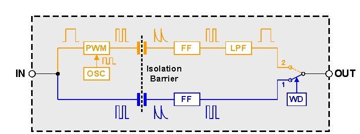 低速路徑比高速路徑多出幾個功能元件。因為低頻輸入信號要求隔離勢壘禁止采用大電容,所以輸入信號被用于對內(nèi)部振蕩器(OSC)的載波頻率進行脈寬調(diào)制(PWM)。這就構成了一個非常高的頻率,能夠通過該電容勢壘。由于輸入得到了調(diào)制,因此必須在實際數(shù)據(jù)傳輸至輸出端以前使用低通濾波器(LPF)去除其中的高頻載波。