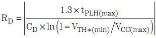當(dāng)總線電壓變?yōu)檎╒Bus > 200 mV)時(shí),RX1 輸出變?yōu)楦?,其?qū)動(dòng) DR2 輸出為高,并通過 RD 對(duì) CD 緩慢充電。必須正確計(jì)算最小時(shí)間常量(RD × CD),以使最大電源電壓 VCC(max) 和最小正反相器輸入閾值VTH+(min) 時(shí),延遲時(shí)間tD 超過驅(qū)動(dòng)器最大低到高傳播延遲 tPLH(max),即超出 30%。例如,電容為 CD = 100 Pf 時(shí),RD 的要求電阻值為: