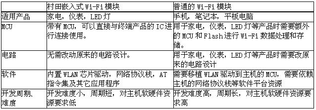 用于通訊產(chǎn)品的Wi-Fi模塊,因?yàn)榻K端產(chǎn)品,如手機(jī),筆記本具有強(qiáng)大的CPU和Flash進(jìn)行數(shù)據(jù)處理和存儲,因此在使用Wi-Fi時不需要額外的MCU。但是用于家電,儀表,LED燈等產(chǎn)品的Wi-Fi模塊,因?yàn)榻K端產(chǎn)品的MCU和Flash都無法支持Wi-Fi的功能,因此需要額外的MCU和Flash進(jìn)行數(shù)據(jù)處理和存儲。為在這些產(chǎn)品上的應(yīng)用提供方便,簡單的解決方案,村田開發(fā)了帶有MCU的Wi-Fi模塊-嵌入式Wi-Fi模塊。