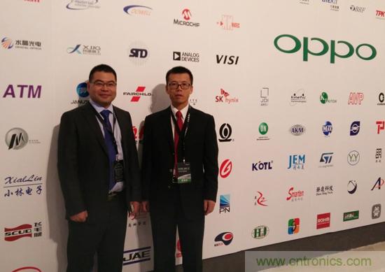 廣東歐珀資源開發(fā)部部長劉波先生 (左) 與 Fairchild 大中華地區(qū)副總裁賴長青先生 (右) 在頒獎(jiǎng)禮上合照
