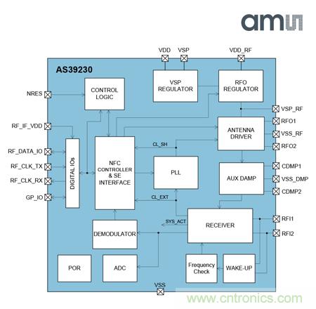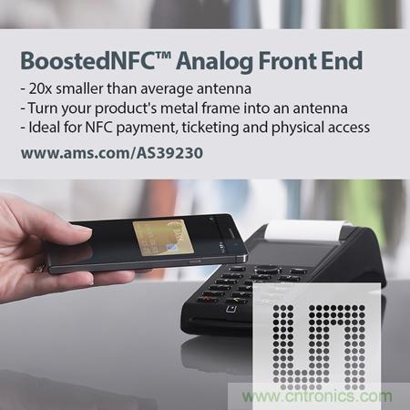 ams的新AS39230可提升天線信號質(zhì)量,從NFC標簽、卡或卡仿真器向NFC讀寫器發(fā)送信號,AS39230的信號強度是采用傳統(tǒng)無源負載調(diào)制(PLM,passive load modulation)方法的10倍。在空間受限的設(shè)計中,天線尺寸可縮至二十分之一,面積僅為100mm2或更小,同時可以保持信號強度不變。AS39230甚至準許產(chǎn)品的金屬殼充當天線,將NFC天線所需的電路板空間及相關(guān)成本降至零。