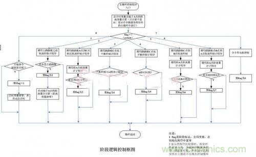 系統(tǒng)框圖如圖3所示,主控循環(huán)程序每隔一個(gè)采樣周期從FPGA接口中讀取各個(gè)傳感器的數(shù)值,并經(jīng)過處理后獲得小車的運(yùn)行狀態(tài),根據(jù)小車的當(dāng)前狀態(tài)采取相應(yīng)的控制算法計(jì)算出電機(jī)所需的控制電壓值,進(jìn)而,該控制電壓值經(jīng)過PMW處理后輸出到小車驅(qū)動(dòng)電機(jī),使小車按照希望的規(guī)律運(yùn)動(dòng)。為了使程序流程清晰簡潔,框圖中以一個(gè)標(biāo)志信號(hào)來記錄小車所運(yùn)行的階段,控制器則根據(jù)小車所處的運(yùn)行階段進(jìn)行相應(yīng)的控制。