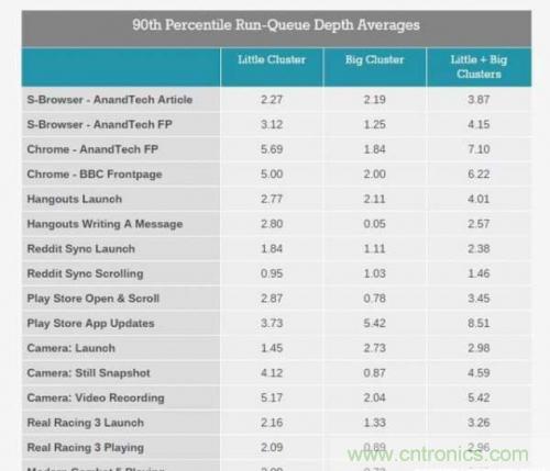 測試者對16個不同的場景進行測試,并且每個場景的表現(xiàn)都通過圖表體現(xiàn)了出來。從圖片結論中我們可以看出,核心越多,設備表現(xiàn)就越好,尤其是在電源和負載的分配上。我們看到,四核處理器要比雙核更高效,而兩個單獨的核心群要比一個更大的核心表現(xiàn)更好。