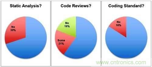 接著讓我們繼續(xù)更深入一點探討:要符合產(chǎn)業(yè)安全性標準,可能耗費大量成本與時間,那么要實現(xiàn)一個優(yōu)良設(shè)計的其他最佳實作呢?例如在軟體設(shè)計上使用編碼標準、程式碼審查以及統(tǒng)計分析?在這個技術(shù)領(lǐng)域從事攸關(guān)安全裝置設(shè)計的工程師受訪者們的回應(yīng)更令人擔(dān)心了,請看下圖的統(tǒng)計: