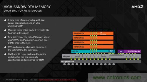 有了先進工藝的采用,雖然我們只得到很少的信息,但可以確定Nvidia和AMD的最新架構(gòu)將在所有的在圖形處理中實現(xiàn)全新的內(nèi)核邏輯。兩種架構(gòu)都將實現(xiàn)高帶寬的存儲,并集成在GPU封裝中,如下圖所示。