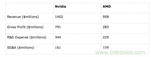 另一個重要的優(yōu)勢是,Nvidia公司的財務實力在恢復。目前Nvidia是盈利的,并有望在研發(fā)中比AMD投入更多的的資金,而此前則不得不削減營運費用。下面的表格提供了兩家公司最新一個季度的財務狀況比較: