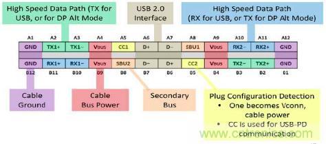 圖1:USB Type-C的接口功能定義,從結(jié)構(gòu)上實現(xiàn)了無方向正反插