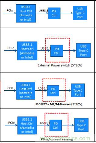 圖2:四種USB Type-C過流保護(hù)方案設(shè)計架構(gòu)