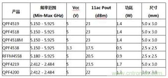 新的Qorvo FEM支持最新一代802.11ac和Wave 2 1024QAM家居Wi-Fi產(chǎn)品,功耗比現(xiàn)今市面同類產(chǎn)品低2瓦特。這足以使一些Wi-Fi聯(lián)網(wǎng)設(shè)備的風(fēng)扇變得不必要,進一步降低功耗,減小尺寸。5 GHz FEM現(xiàn)在提供樣片;2.4 GHz型號將在2017年一季度推出。下表總結(jié)了新Qorvo Wi-Fi FEM系列的規(guī)格。