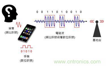 現(xiàn)在的手機是屬于「數(shù)字通信」,也就是我們講話的聲音(連續(xù)的模擬信號),先由手機轉(zhuǎn)換成不連續(xù)的 0 與 1 兩種數(shù)字信號,再經(jīng)由數(shù)字調(diào)變轉(zhuǎn)換成電磁波(模擬信號載著數(shù)字信號),最后從天線傳送出去,原理如圖一所示。