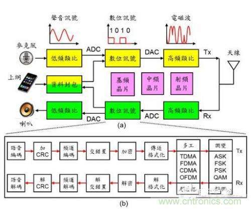 數(shù)字通信系統(tǒng)的架構(gòu)如圖二(a)所示,使用者可能使用智能型手機打電話進(jìn)行語音通信或上網(wǎng)進(jìn)行數(shù)據(jù)通信,我們分別說明如下: