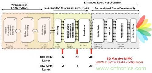 對于 6GHz 以下的部署,5G 系統(tǒng)通常多達(dá) 64 個天線單元。6GHz 以上可有更多的天線單元數(shù)量。數(shù)字波束形成一般用在 6GHz 頻率以下的情況(在基帶中實(shí)現(xiàn));而結(jié)合了數(shù)字和模擬波束形成技術(shù)的混合方案則用于 6GHz 以上頻率。包含 64 個天線單元的 Massive MIMO 系統(tǒng)配置會顯著增加復(fù)雜性和成本,因?yàn)橐С?L1 基帶中數(shù)字波束形成所需的大量有源無線電信號鏈和預(yù)編碼計算?;鶐幚硇盘栨溑c遠(yuǎn)端射頻單元之間的連接要求急劇增加。為了比較經(jīng)濟(jì)地實(shí)現(xiàn)這些系統(tǒng),有必要在無線電中集成 L1 基帶信號處理或其中的一部分。未來的這種功能劃分可能導(dǎo)致網(wǎng)絡(luò)節(jié)點(diǎn)中 L1-L2 與無線電功能處在相同位置。圖 3 介紹了 64 個天線單元的 Massive MIMO 在不同系統(tǒng)功能邊界上的連接要求,凸顯了 L1 與無線電共址的必要性。