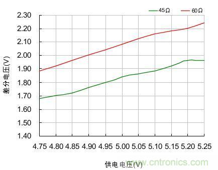 差分電壓除負(fù)載電阻的影響外,還會(huì)受到供電電壓的影響,如圖 2我們測試了CTM1051M模塊在不同電壓,不同負(fù)載下的差分電壓幅值,可以看到電源電壓升高0.5V,差分電壓幅值會(huì)升高約0.3V。