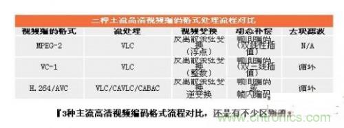 我們下面來(lái)看看主流的3種編碼格式,包括Mpeg2、VC-1、H.264的解碼流程對(duì)比(見(jiàn)下圖)??梢钥闯?,幾種編碼格式還是有不少區(qū)別的,這也是造成幾種編碼格式要求不同的原因,H.264編碼格式最為復(fù)雜,因此系統(tǒng)要求最高,VC-1略有降低,但是也比Mpeg2高得多。