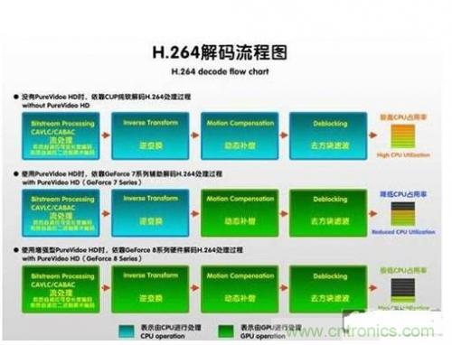 下圖H.264的解碼過(guò)程很好的說(shuō)明了問(wèn)題。如果顯卡不承擔(dān)任何步驟(圖解第一行),那么CPU占用率很高,甚至根本無(wú)法流暢播放;如果顯卡能實(shí)現(xiàn)后兩個(gè)步驟的解碼處理(圖解第二行),CPU可以獲得部分解放,但是對(duì)于比較關(guān)鍵的、負(fù)載最大的“流處理”,部分顯卡還不能實(shí)現(xiàn),所以CPU占用率有所下降,但是仍然偏高。
