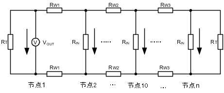 圖 4中,各節(jié)點(diǎn)的RW、RIN難以準(zhǔn)確確定,組網(wǎng)時(shí)以公式計(jì)算較為繁瑣,簡(jiǎn)便的方法便是測(cè)量總線兩端的節(jié)點(diǎn)電壓。如網(wǎng)絡(luò)的總線電阻過(guò)大時(shí),節(jié)點(diǎn)1到節(jié)點(diǎn)n總線對(duì)信號(hào)的損耗會(huì)很大,當(dāng)節(jié)點(diǎn)n接收的差分電壓低于1.2V時(shí),需要增大終端電阻。