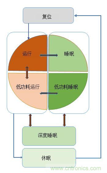在考慮 MCU 的功耗模式時(shí),超越其基本架構(gòu)十分重要。例如,標(biāo)準(zhǔn) ARM CPU 內(nèi)核支持運(yùn)行、睡眠和深度睡眠。附加功耗模式通常由特定的 MCU 供應(yīng)商添加。例如,賽普拉斯的 PSoC 6 BLE MCU可執(zhí)行包括,低功耗運(yùn)行、低功耗睡眠和休眠狀態(tài)在內(nèi)的六種工作功耗模式。