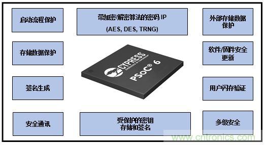 由于許多物聯(lián)網(wǎng)系統(tǒng)會(huì)處理用戶的個(gè)人數(shù)據(jù),因此確保數(shù)據(jù)的安全尤為重要。代碼存儲(chǔ)器也同樣需要保護(hù),以防止設(shè)備被非法入侵。外部存儲(chǔ)器在安全性方面更加脆弱,因此需要特殊的機(jī)制來(lái)保護(hù)外部存儲(chǔ)的數(shù)據(jù)。為此,MCU 使用各種加密技術(shù)(例如 AES、DES、RSA)來(lái)保護(hù)數(shù)據(jù)和代碼免受非法訪問。例如,賽普拉斯半導(dǎo)體的 PSoC 6 BLE MCU 提供了一個(gè)特殊的串行存儲(chǔ)器接口(SMIF)外設(shè),該外設(shè)支持直接執(zhí)行外部代碼的 XIP(現(xiàn)場(chǎng)執(zhí)行)模式和記錄數(shù)據(jù)的 MMIO(內(nèi)存映射 IO)模式。它使用特殊命令進(jìn)行控制,比如閃存的編程/擦除、存儲(chǔ)器設(shè)備的睡眠模式輸入等。